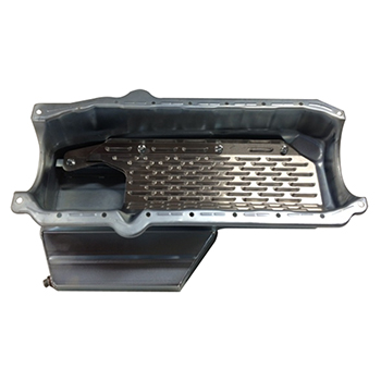 Part Type: Oil Pan Application: '57-'85 Chevrolet SB Oil Pan Style: Asphalt Circle Track Rear Main Seal Type: 2-Piece Dipstick Location: Driver or Passenger Side Oil Pan Capacity: 7 Quarts (with filter) Oil Pan Sump Depth: 6.5" Oil Pan Sump Width: 14" Oil Pan Material: Steel Sump Location: Rear Sump Style: Wet Stroker Clearanced: No Maximum Stroke with Most Steel Rods: 4.125" Kickout: No Trap Door Baffles: 6 Windage Tray Included: Removable Sump Tray Included: No Crankshaft Scraper Included: Yes Dipstick Provision: No Dipstick Included: No Oil Level Sight Plug: YesYes Oil Temp Fitting: Yes Drain Plug Included: Yes Oil Pump Included: No Oil Pump Shaft Included: No Oil Pump Hardware Included: No Oil Pump Pickup Included: No Recommended Oil Pickup for M55 Style Pump : NA Recommended Oil Pickup for M55HV Style Pump : 106SB Recommended Oil Pickup for M77HV Style Pump : NA Recommended Oil Pickup for M155HV Style Pump : NA Oil Pan Hardware Included: No Gaskets Included: No Oil Pan Finish: Clear Zinc Manufacturer: Champ Pans Manufacturer's Part Number: CP106LT Weight: 16 lbs. Quantity: Sold as Each Note: Accusump recommended because of pan's lower oil capacity, unless you are using a remote cooler and oil filter adapter