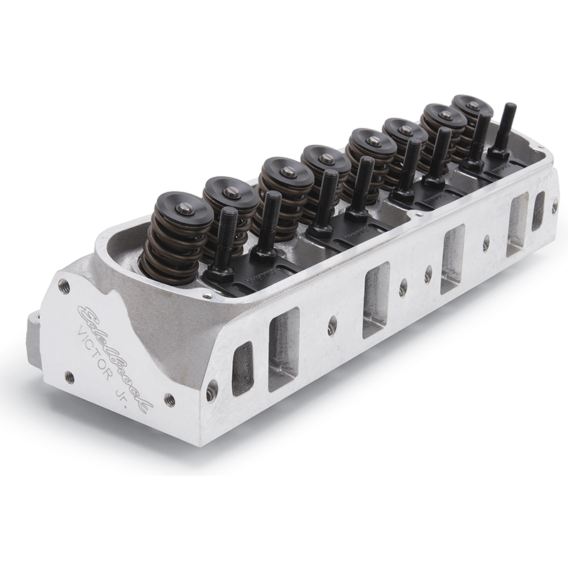 Edelbrock Victor Jr. Ford SB Aluminum Head 500+ HP potential out-of-the-box using stock valve train geometry. High-flowing 210cc intake runners and .130" raised 75cc exhaust ports. Raised valve cover rails. Fully assembled with stainless steel valves, HP springs, steel retainers, guide plates, and rocker sutds.