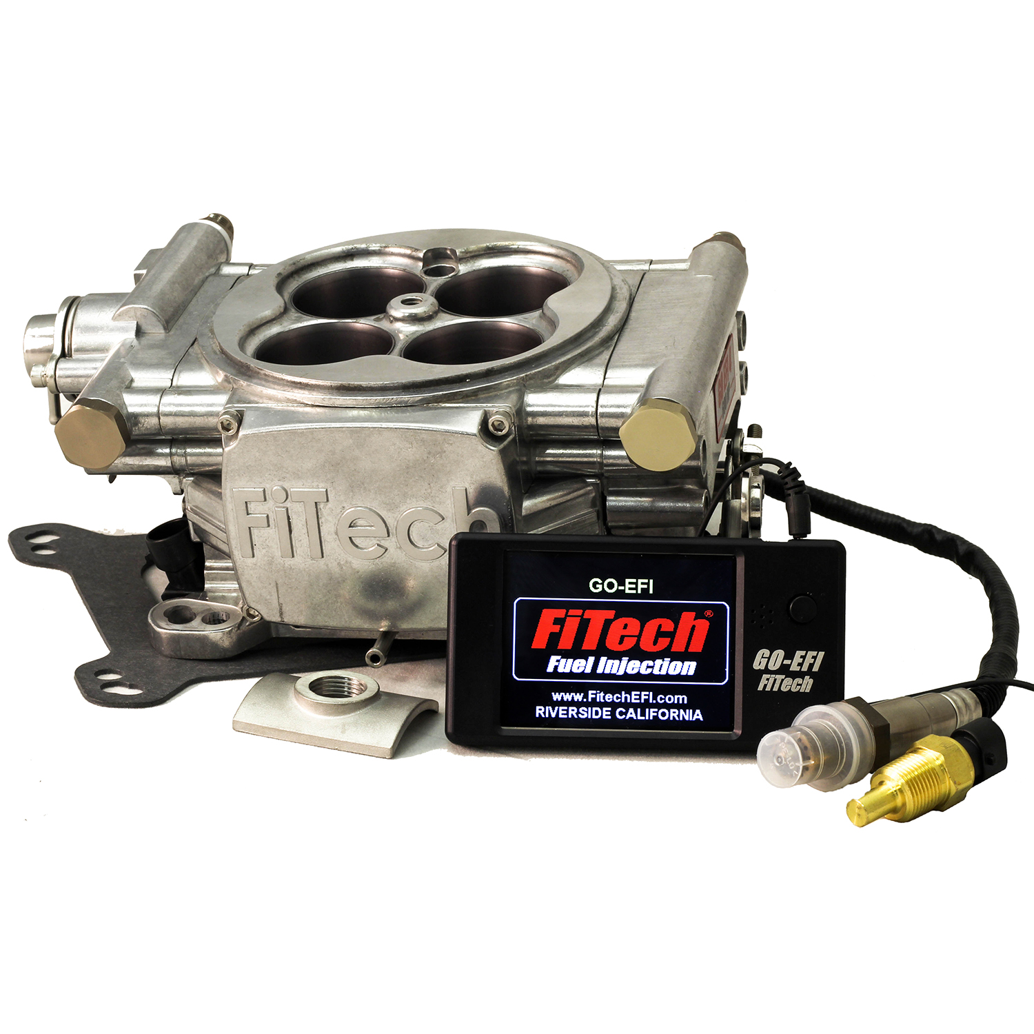 FiTech Fuel Injection Go EFI 4 250 HP to 600 HP Self-Tuning System The Go EFI 4 Self-Tuning Fuel Injection is rated at 600 HP but is suitable for engines from 250 HP through 600 HP. This system is perfect for your everyday Driver right up to your weekend Street Machine or Bracket Racer. It features the FASTEST most accurate Self-Learning available, Timing control, Wet flow Annular discharge, and tons of additional features. It fits any 4bbl intake manifold and is the most self-contained and full-featured unit of this type. The ECU (computer) is mounted on the throttle body, which greatly simplifies installation. No hole in your firewall and no unsightly harness draped across your engine. This is also the only computer mounted throttle body that offers spark control without the need for an external spark box or special distributor. It also has a built-in fuel pressure regulator. A hand-held controller features a touch screen for quick and easy initial set-up.
