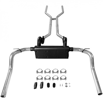 Part Type: Exhaust System Application: '67-'74 Chevrolet Camaro 5.0L, 5.4L, 5.7L, 6.5L, 6.6L, 7.0L V8 (see notes) '68-'74 Chevrolet Nova 5.0L, 5.4L, 5.7L, 6.5L, 6.6L V8 (see notes) '67-'74 Pontiac Firebird 5.0L, 5.4L, 5.7L, 6.5L, 6.6L, 7.0L V8 (see notes) System Series: American Thunder System Type: Header Back - Dual Tone Level: Moderate Inlet Diameter: 2.50" Outlet Diameter: 2.50" Tubing Diameter: 2.50" Muffler Series: 80 Series Crossflow Muffler Quantity: 1 Heatshield: Yes H-Pipe: Yes Hardware Included: Yes Exit Position: Dual Rear Exit Tip(s) Included: No Tip Diameter: NA Tip Material: NA Material: 16 Gauge Aluminized Steel Finish: Aluminized Manufacturer: Flowmaster Manufacturer's Part Number: 17104 Weight: 80.0 lbs. Warranty: Limited 3-Year Quantity: Sold as Kit