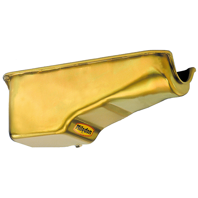 Milodon Stock Replacement Oil Pan Quality generic stock replacements for factory oil pans. For engines that are not intended for racing and just need a new stock style pan. Excellent fit and flat unwarped pan rails, unlike most imported chrome stock replacement pans. Milodon's distinctive gold iridited finish assures quality and a distinctive look. They have very effective internal horizontal baffles for proper oil control. Pans for Ford trucks will work on front sump only. Made in USA.