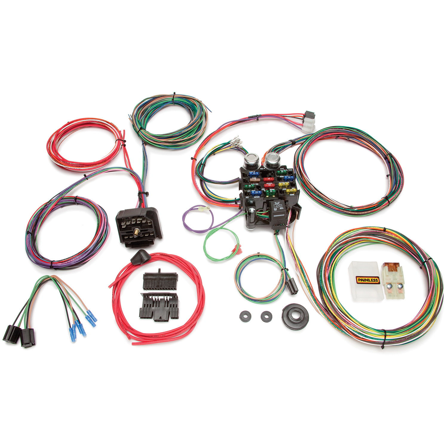Painless Direct Fit Chassis Harnesses This 22 circuit Painless Performance factory upgrade harness for 1976-1986 CJ Jeeps uses the OEM style fuse block. Open ended wire leads allow for custom routing of the wiring for your CJ. This harness is designed to be a customizable kit, and routes the wire through the firewall via a bulkhead connector. Like from the factory on your Jeep, the ignition switch is in the column. This kit includes GM column mounted ignition switch connectors and a GM column mounted turn signal switch connector pre-terminated and ready to install. Also included are pre-wire plugs for headlights and the dimmer switch. Each wire is custom printed with the circuit identification as well as using factory color codes for easy installation. Connections Included: Column mounted ignition switch, turn switch, dimmer switch, two headlight pigtails, 10SI & 12SI Alternator, HEI Power and tach and 20 extra 56 series terminals for use with factory GM 56 series connector such as headlight switch, wiper switch or AC switch/blower motor.