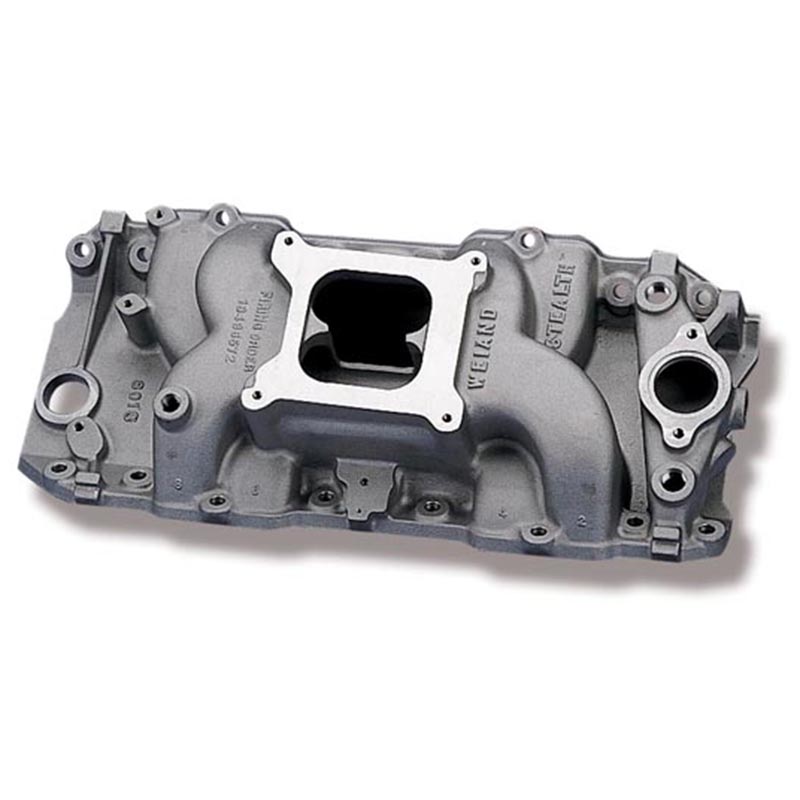 Weiand Stealth Dual Plane Intake Top-of-the-line dual plane manifold combines the low-end throttle response of a 180-degree design with the top-end power you'd expect of a single plane. Extensive dynamometer testing confirms that "Speed Warrior" is the ultimate dual plane on the market, with a power range from idle through 6800 RPM. Best suited for engines that are 350-400ci. displacement. Designed for straight flange carbs.
